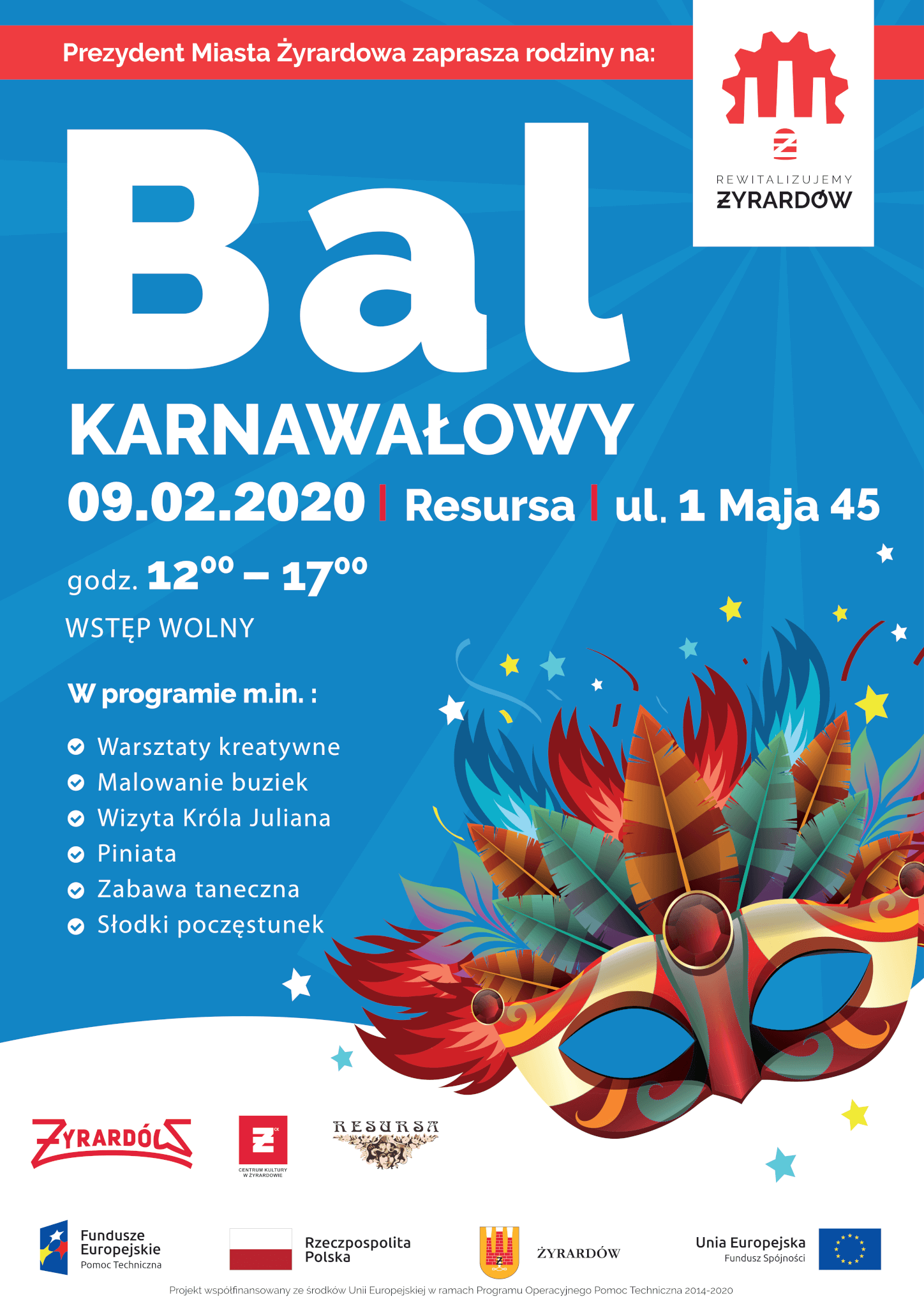 Prezydent Miasta Żyrardowa Lucjan Krzysztof Chrzanowski serdecznie zaprasza dzieci wraz z opiekunami na bal karnawałowy w Resursie. Spotykamy się w niedzielę, 9 lutego, o godz. 12.00 Oprócz zabawy tanecznej pojawią się inne ciekawe atrakcje. Zaplanowano m.in. robienie ozdobnych masek, kolorowych peruk i fantazyjnych strojów oraz malowanie buziek. Podczas wspólnego świętowania (...)